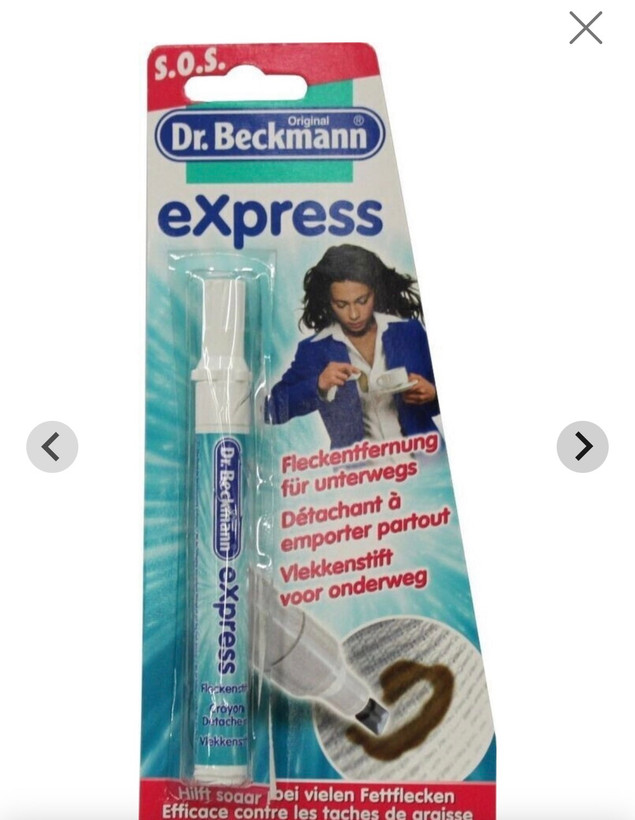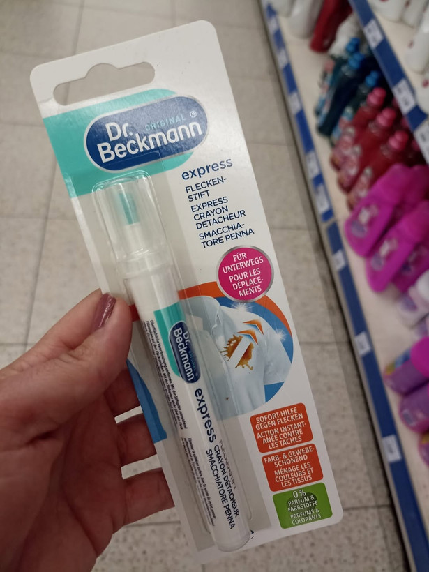 خداحافظی با لکههای مزاحم فقط در چند ثانیه! با لکهبر فوری Dr. Beckmann دیگه لازم نیست نگران لکههای ناگهانی روی لباسهاتون باشید. کافیست این قلم جادویی رو همیشه همراه داشته باشید و در هر زمان و مکان، لکهها رو پاک کنید. حذف سریع لکهها (قهوه، چای، سس و …) سازگار با رنگ و بافت پارچه بدون عطر و رنگ مصنوعی قابل حمل و عالی برای بیرون از خانه همیشه تمیز و بینقص دیده بشید!