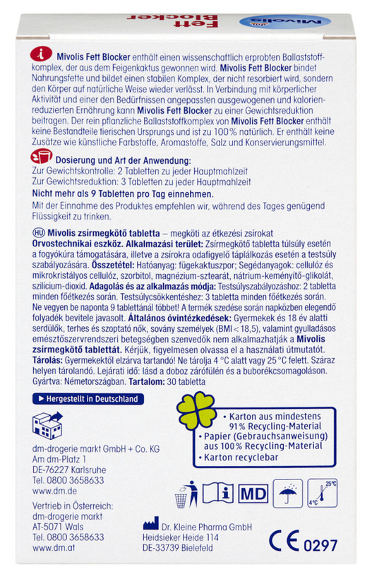 قرص Mivolis Fett Blocker یک مکمل گیاهی و علمی تأییدشده از آلمان است که با استفاده از فیبر طبیعی کاکتوس انجیری (Feigenkaktus) تولید میشود. این محصول با جذب و مسدود کردن چربیهای غذایی، باعث کاهش کالری دریافتی و افزایش احساس سیری میشود. فرمولاسیون آن ۱۰۰٪ طبیعی بوده و فاقد رنگ، طعمدهنده، نمک و مواد نگهدارنده مصنوعی است. مصرف منظم این مکمل در کنار رژیم متعادل و فعالیت بدنی میتواند به کاهش وزن مؤثر و سالم کمک کند.