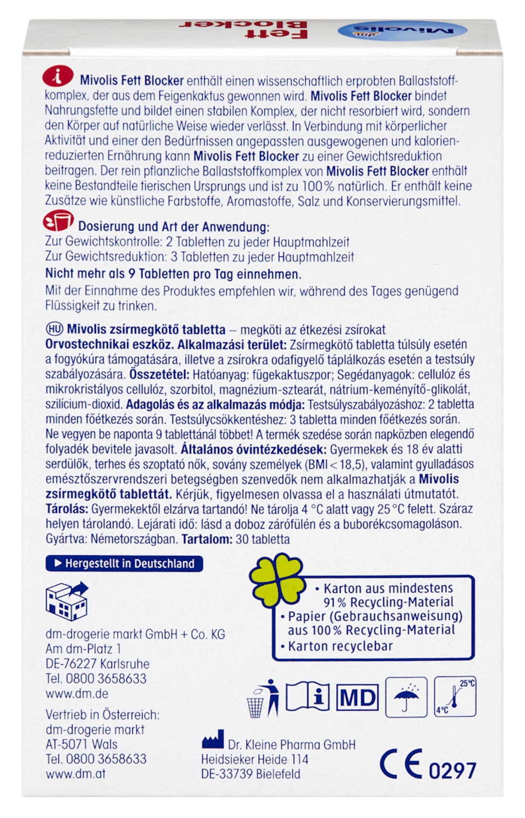 قرص Mivolis Fett Blocker یک مکمل گیاهی و علمی تأییدشده از آلمان است که با استفاده از فیبر طبیعی کاکتوس انجیری (Feigenkaktus) تولید میشود. این محصول با جذب و مسدود کردن چربیهای غذایی، باعث کاهش کالری دریافتی و افزایش احساس سیری میشود. فرمولاسیون آن ۱۰۰٪ طبیعی بوده و فاقد رنگ، طعمدهنده، نمک و مواد نگهدارنده مصنوعی است. مصرف منظم این مکمل در کنار رژیم متعادل و فعالیت بدنی میتواند به کاهش وزن مؤثر و سالم کمک کند.