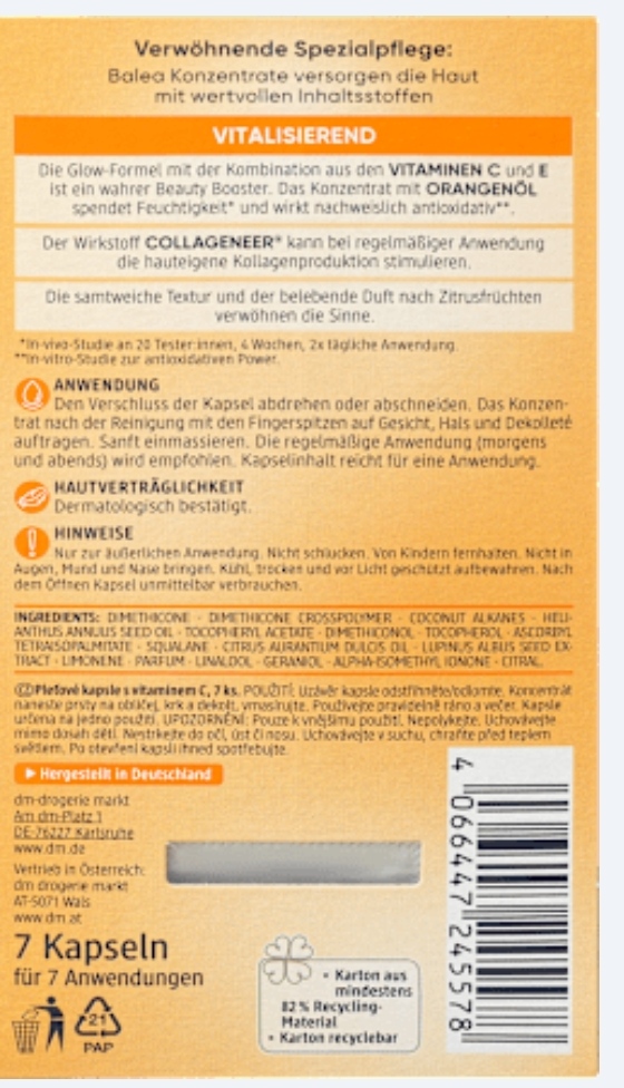 کنسانتره ویتامین C بالئا یک تقویتکننده قوی برای پوست است که با ترکیب ویتامینهای C و E، خاصیت آنتیاکسیدانی و ضد پیری دارد. این سرم با فرمول حاوی روغن پرتقال، پوست را مرطوب کرده، درخشندگی طبیعی و ظاهری سالم و شاداب به آن میبخشد. مادهی فعال Collageneer® نیز به تحریک تولید کلاژن کمک میکند تا پوست جوانتر و سفتتر به نظر برسد. دارای بافتی نرم و عطری دلانگیز از مرکبات. ساخت آلمان 🇩🇪