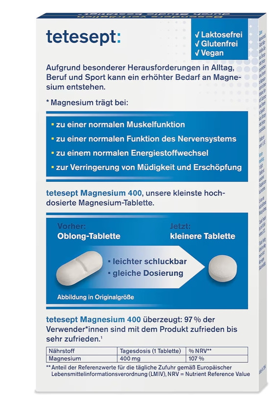 مکمل غذایی Magnesium 400 از برند معتبر tetesept، یک دوز بالای منیزیم برای حمایت از عملکرد طبیعی عضلات، سیستم عصبی و سوختوساز انرژی در بدن است. این مکمل با 400 میلیگرم منیزیم خالص، 100٪ نیاز روزانه بدن را تأمین میکند و به کاهش خستگی و عملکرد بدنی بهتر کمک میکند.این قرص برای گروههای زیر مناسب است: