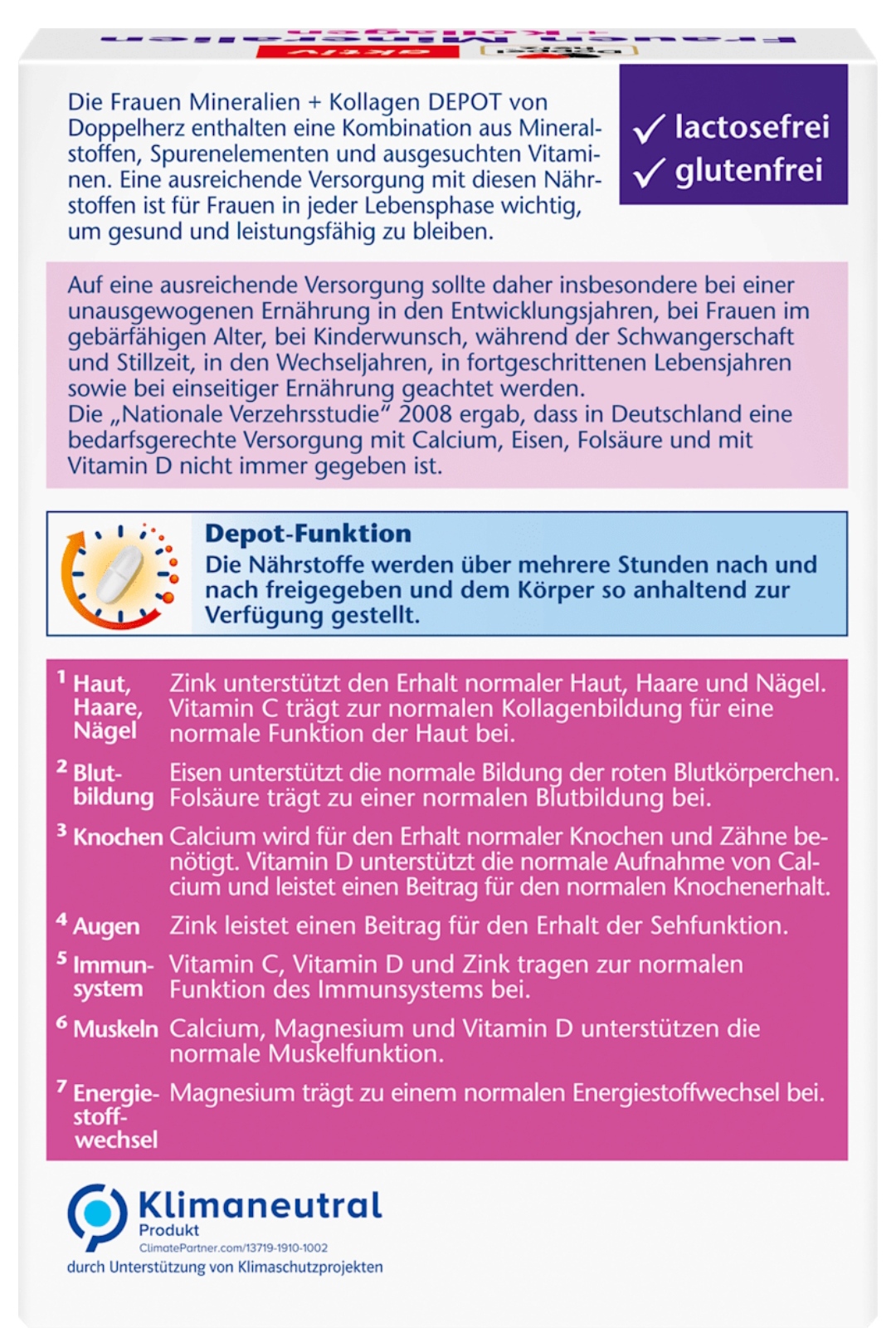 براساس «مطالعه ملی تغذیه آلمان ۲۰۰۸»، مصرف کافی کلسیم، آهن، فولیک اسید و ویتامین D در بسیاری از زنان به میزان مطلوب انجام نمیشود. این مکمل با ارائه یک فرمول کامل و علمی به تأمین این کمبودها کمک میکند.