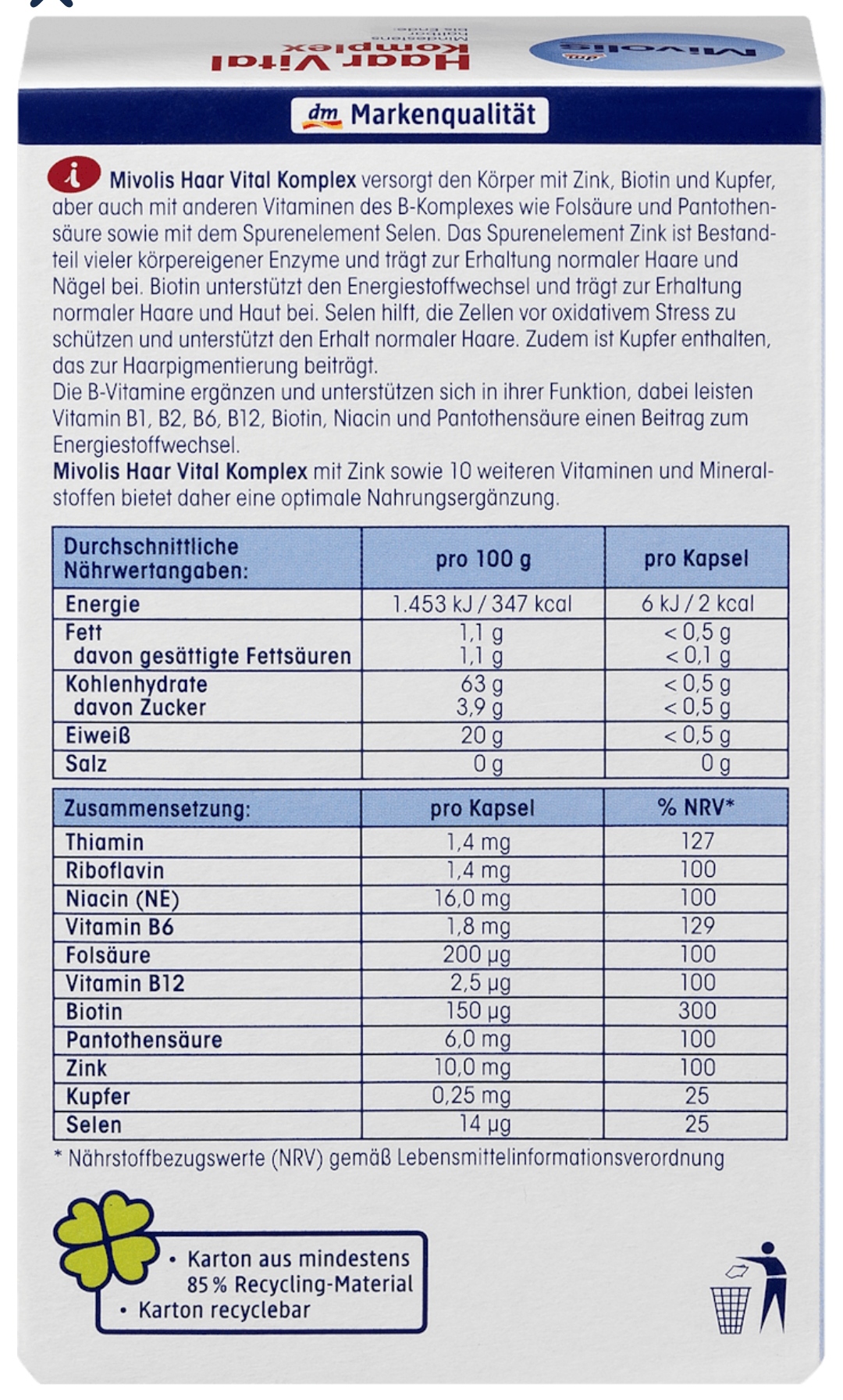 کمپلکس تقویت مو Mivolis Haar Vital، ترکیبی کامل از بیوتین، زینک، سلنیوم و مس بههمراه ۱۰ ویتامین و مواد معدنی ضروری است که به حفظ سلامت مو، پوست و ناخن کمک میکند. زینک نقش مهمی در حفظ مو و ناخنهای طبیعی داشته و بیوتین از متابولیسم انرژی و سلامت مو و پوست پشتیبانی میکند. سلنیوم با خاصیت آنتیاکسیدانی از سلولها در برابر استرس اکسیداتیو محافظت کرده و به سلامت مو کمک میکند. وجود مس در این مکمل به حفظ رنگدانه طبیعی مو کمک مینماید. همچنین ویتامینهای گروه B مانند B1، B2، B6، B12، نیاسین، اسید فولیک و پانتوتنیک اسید با عملکرد هماهنگ، به افزایش انرژی و سلامت عمومی بدن کمک میکنند.