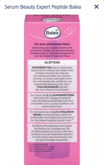 سرم Balea Beauty Expert Peptide Serum با فرمولاسیون پیشرفته حاوی 0.1٪ پپتید مس (Copper Peptide) و 0.2٪ هیالورونیک اسید طراحی شده تا بهطور مؤثر به کاهش خطوط ریز، تقویت کلاژنسازی و آبرسانی عمیق پوست کمک کند.