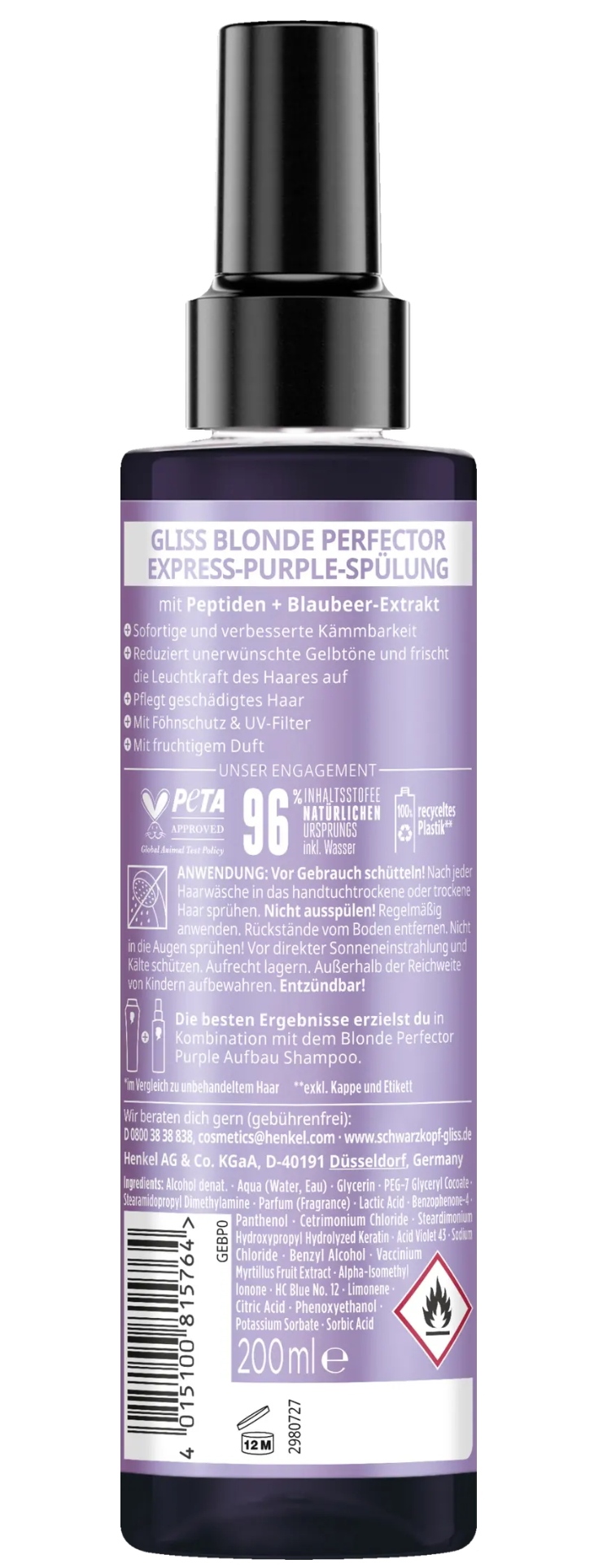 اسپری نرمکننده بنفش برای موهای بلوند با فرمول بنفش فوری، زردی موها رو خنثی کن و بلوندت رو شفاف و سرد نگه دار! ايدهآل برای موهای بلوند رنگشده، دکلرهشده یا خاکستری که به مراقبت سریع و نتيجه فوری نياز دارن.