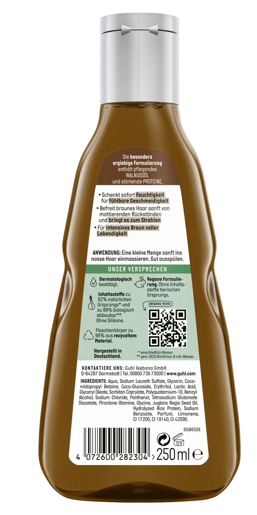 درخشش طبیعی برای موهای قهوهای! شامپو GUHL با روغن گردو، مخصوص موهای رنگشده یا طبیعی قهوهای. فرمول جدید برای مراقبت، تغذیه و برق طبیعی موها.