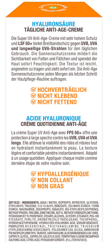 کرم ضد آفتاب صورت SPF 50+ (محافظت بسیار بالا) با ترکیبات کلیدی هیالورونیک اسید (آبرسان و ضد چروک) مناسب برای استفاده روزانه، بدون چربی و قابل استفاده زیر آرایش.