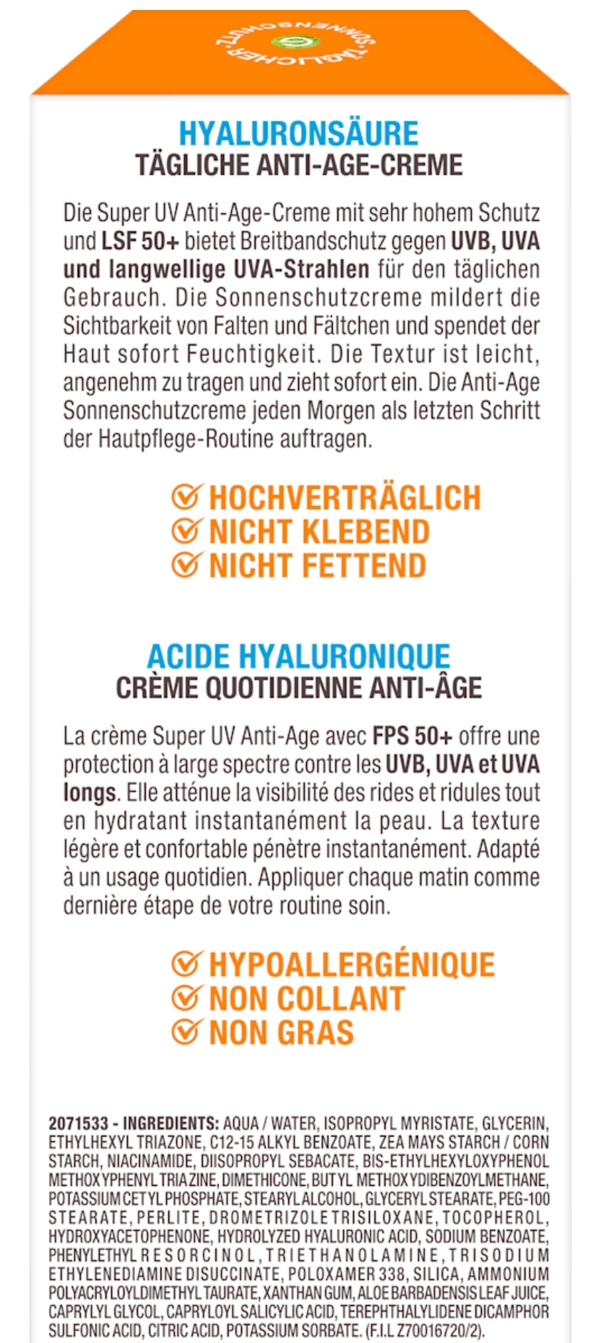 کرم ضد آفتاب صورت SPF 50+ (محافظت بسیار بالا) با ترکیبات کلیدی هیالورونیک اسید (آبرسان و ضد چروک) مناسب برای استفاده روزانه، بدون چربی و قابل استفاده زیر آرایش.